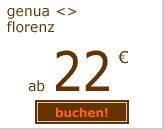 mit dem zug nach genua ist von unzähligen italienischen städten als auch direkt von deutschland aus möglich. alle züge erreichen genua porta principe, den hauptbahnhof von genua im zentrum der stadt. am bahnhof bestehen umsteigemöglichkeiten zum nahverkehr sowie regionalverkehr ins umfeld von genua. wir empfehlen ihnen eine frühzeitige buchung ihres zug genua, sind die preise bei buchung 4 wochen oder früher deutlich günstiger. per klick auf die jeweilige städteverbindung erhalten sie einen direkten überblick mit unserem preiskalender. |